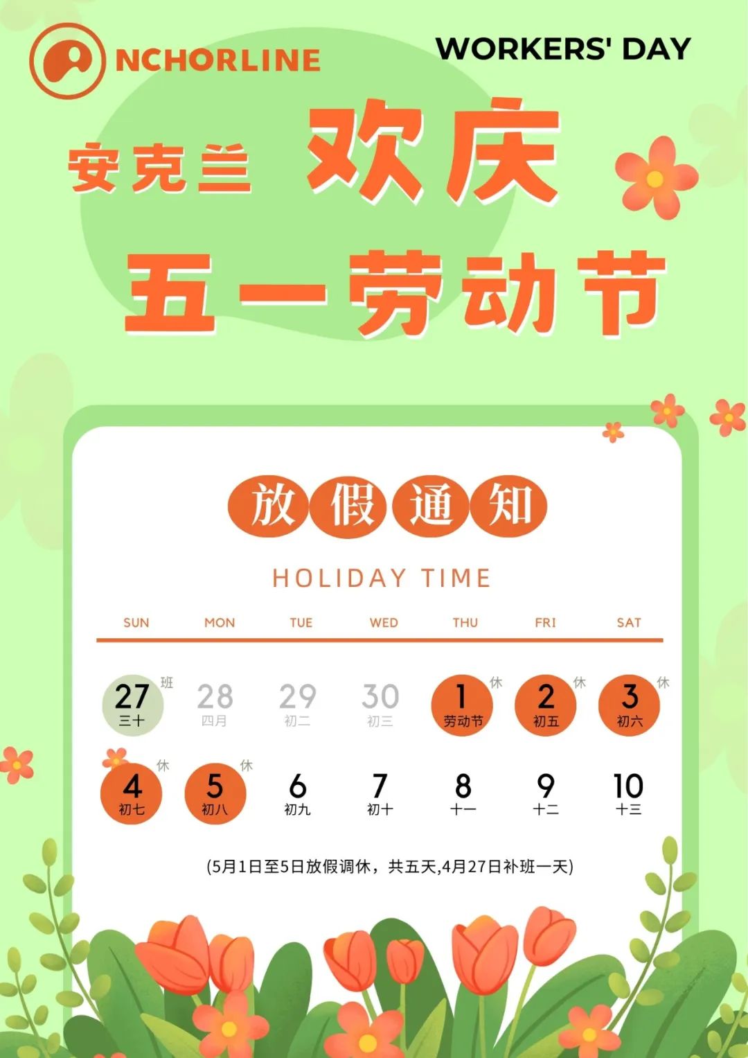 五一国际劳动节将至,在此安克兰向您致以诚挚的节日问候!根据国家法定节假日的相关规定,结合我司实际情况,现将五一劳动节放假安排告知如下: